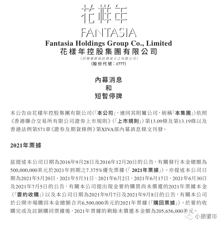 于要約收購?fù)瓿杉白N購回票據(jù)后,花樣年控股上述2021年票據(jù)剩余未償還本金額為2.06億美元。根據(jù)規(guī)管2021年票據(jù)的契約,所有未償還本金均于2021年10月4日到期,其未在該日付款。