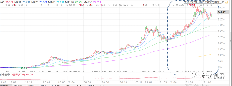 2)部分“核心資產”業績保持穩定,也會因為高估值和風格切換而出現中級別調整,但上升趨勢未破。比如部分白酒股,中報業績符合預期。但隨著資金從核心資產撤離,再加上高估值內在調整需求,也會出現一波調整。一般情況下,到了年線就會有較強支撐。但由于本輪中,前期漲幅過大,風格切換更加堅決,跌破年線成為常態,但一般不會跌破3年線。價格回調(比如50%),疊加業績增長(比如20%-30%),則會迅速消化掉高估值,然后有望再次向上。