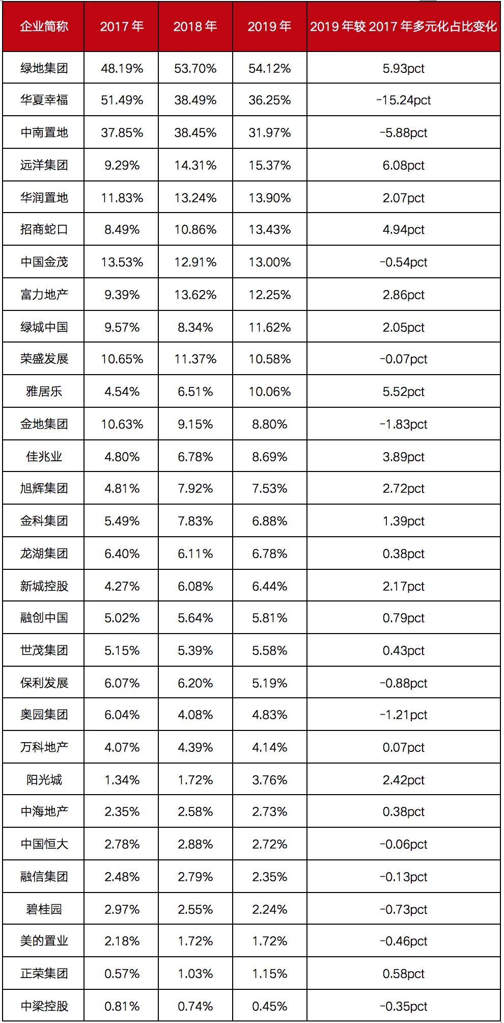 從30家重點房企財務結構來看,2019年變化最大的為綠地集團,多元化業務占總業務比重達到了54.12%,比重達到一半以上。這意味著,經過一系列產業布局優化調整,從2017年至2019年,綠地集團弱化了房地產業在集團整體營業收入中的比重,整體比例已經從53%下降到46%。