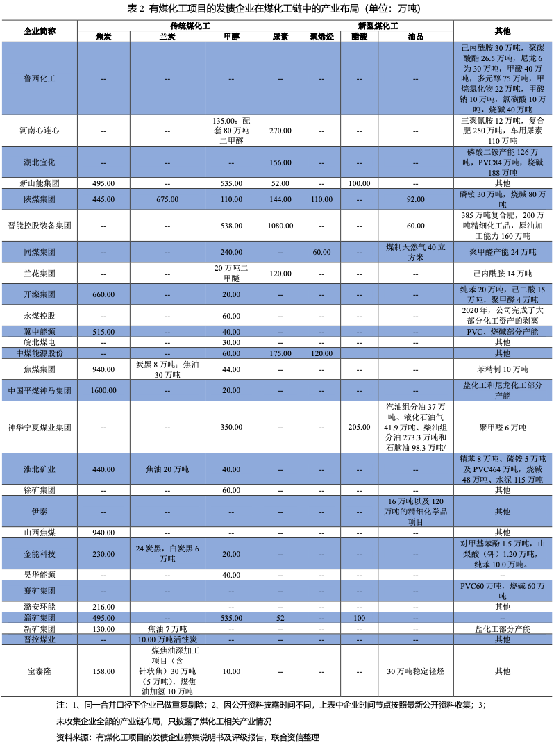 煤化工產業鏈碳排放量居我國三大能源產業鏈之首,為實現碳中和目標,各省已出臺了相應政策,通過政策梳理可以看出煤化工行業未來新增項目的審批將更為嚴格。存量煤化工企業的競爭也會加劇。目前公開市場上有煤化工項目的發債企業以大型煤炭企業和少數無煤炭資源的化工企業為主,其產能布局較多的產品為焦炭和尿素。