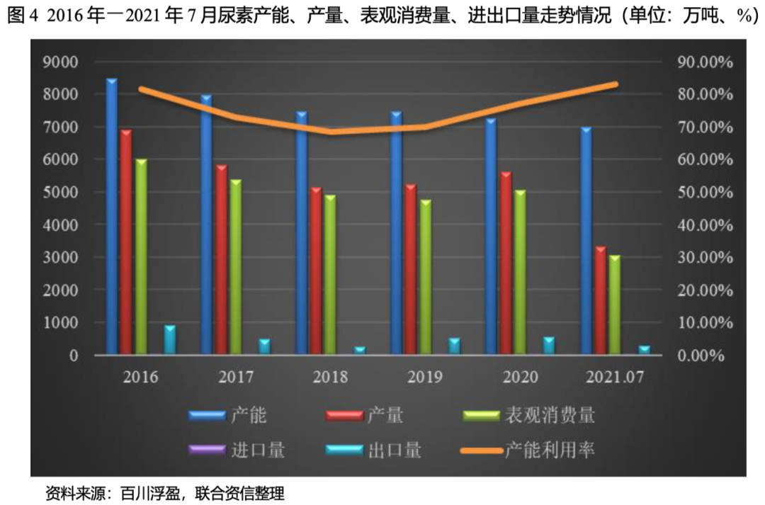近年來,隨著環保約束趨嚴和市場化出清,尿素行業落后產能逐步被淘汰退出市場,同時采用先進工藝的裝置陸續投產,行業整體產能穩中有降。2016-2020年,我國尿素行業年均復合下降7.62%,其中,煤頭尿素年均復合下降5.42%,氣頭尿素年均復合下降2.19%。2021年,我國尿素產能合計6976萬噸,有效產能合計6355萬噸。受益于落后產能的逐步出清,尿素行業產能利用率從2019年逐年回升,2021年7月產能利用率為83.15%,已處于近5年最高水平。