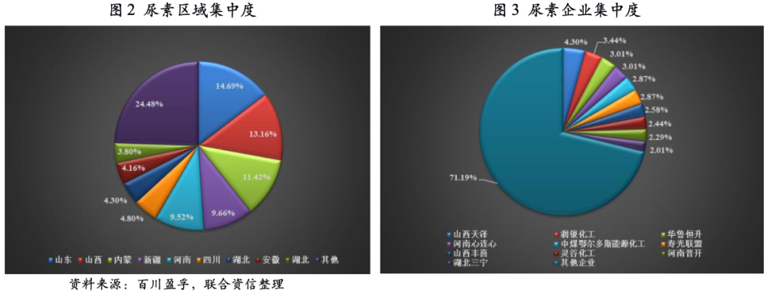 從區域集中度來看,山東、山西、內蒙產能占比靠前,占比分別為14.69%、13.16%和11.42%,但整體較為分散。從企業集中度來看,前十大企業產能合計占比28.81%,排名靠前的企業分別為山西天澤煤化工集團股份公司、山東潤銀生物化工股份有限公司和山東華魯恒升化工股份有限公司(以下簡稱“華魯恒升”),占比分別為4.30%、3.44%和3.01%。整體看,尿素行業集中度較低。