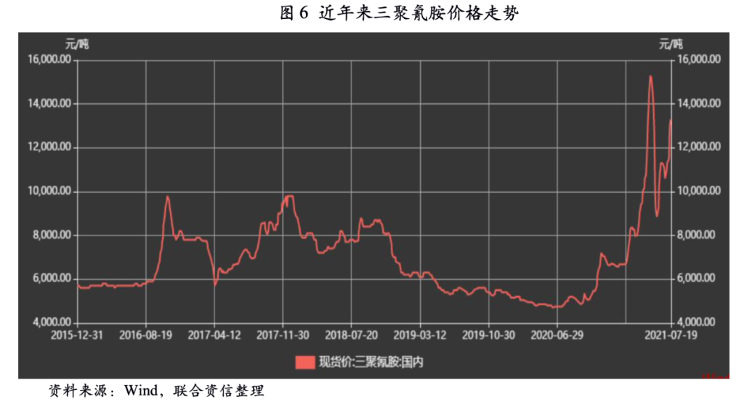三聚氰胺方面,生產一噸三聚氰胺大約需要3噸尿素,三聚氰胺產量已由2016年的96.68萬噸增長至2020年的133.25萬噸,年均復合增長8.35%。目前三聚氰胺價格較高,單噸利潤較好,三聚氰胺整體開工率較高。2021年三聚氰胺有效產能為168.50萬噸,若產能完全釋放將帶動尿素需求較2020年增加約100萬噸。