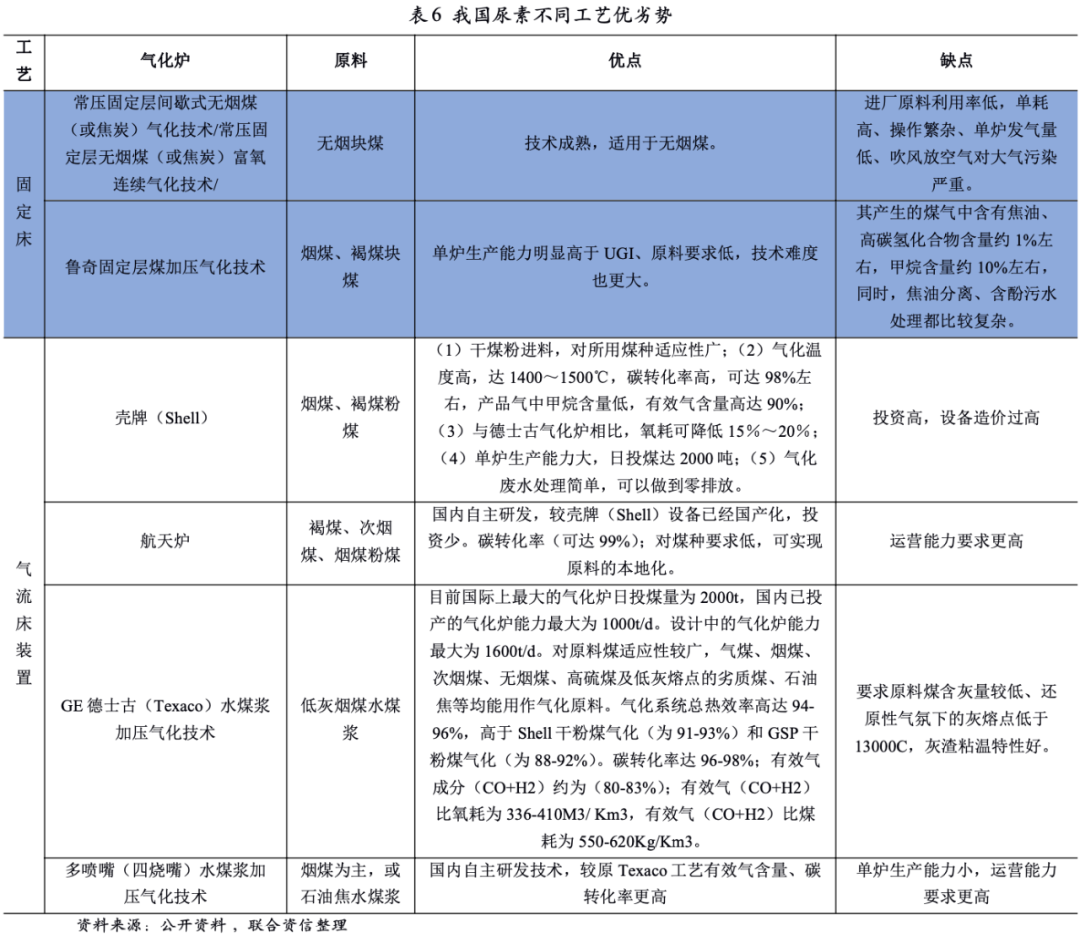 當前煤制尿素煤化工生產裝置主要分為兩類,一種是固定床裝置,一種是氣流床裝置。其中氣流床從進料方式上又可以分為干法(干粉進料)和濕法(水煤漿進料)。干法氣化裝置目前在國內應用較多的主要有殼牌(Shell)和航天爐;濕法氣化裝置目前在國內應用較多的有GE德士古(Texaco)、四噴嘴等,這些氣化爐在原材料、能耗、碳轉化率、投資規模等各方面均不同,具體優劣勢如下表所示。