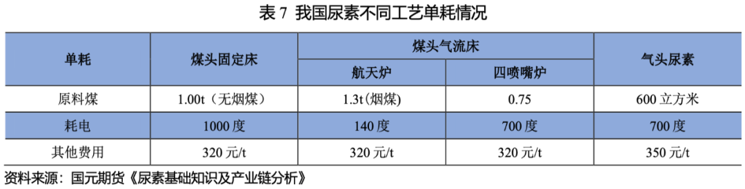 在無煙煤為原料的裝置下,生產1噸尿素,需消耗無煙煤1噸左右,100公斤左右的動力煤,1000度左右的電。在煙煤原料的裝置下,航天爐裝置消耗的煙煤為1.3~1.5噸,耗電量140~200度電;四噴嘴氣化爐裝置消耗的煙煤為0.75~0.79噸,耗電量控制在700~1000度電。氣頭尿素的生產成本主要由天然氣價格、電費和加工費組成,生產1噸尿素需消耗600~800立方米天然氣。