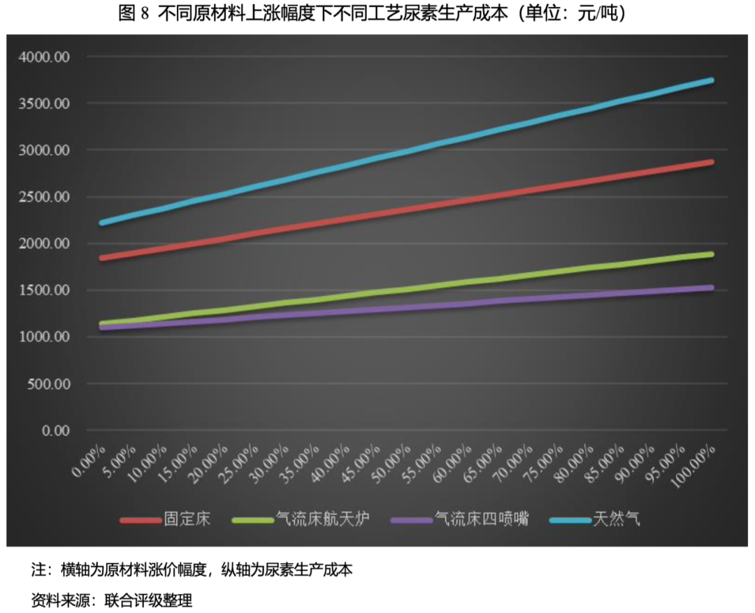 (1)尿素成本構成公式中原料消耗均選取了最低單耗;期間費用選取了特定值,不同企業的成本構成略有差異;