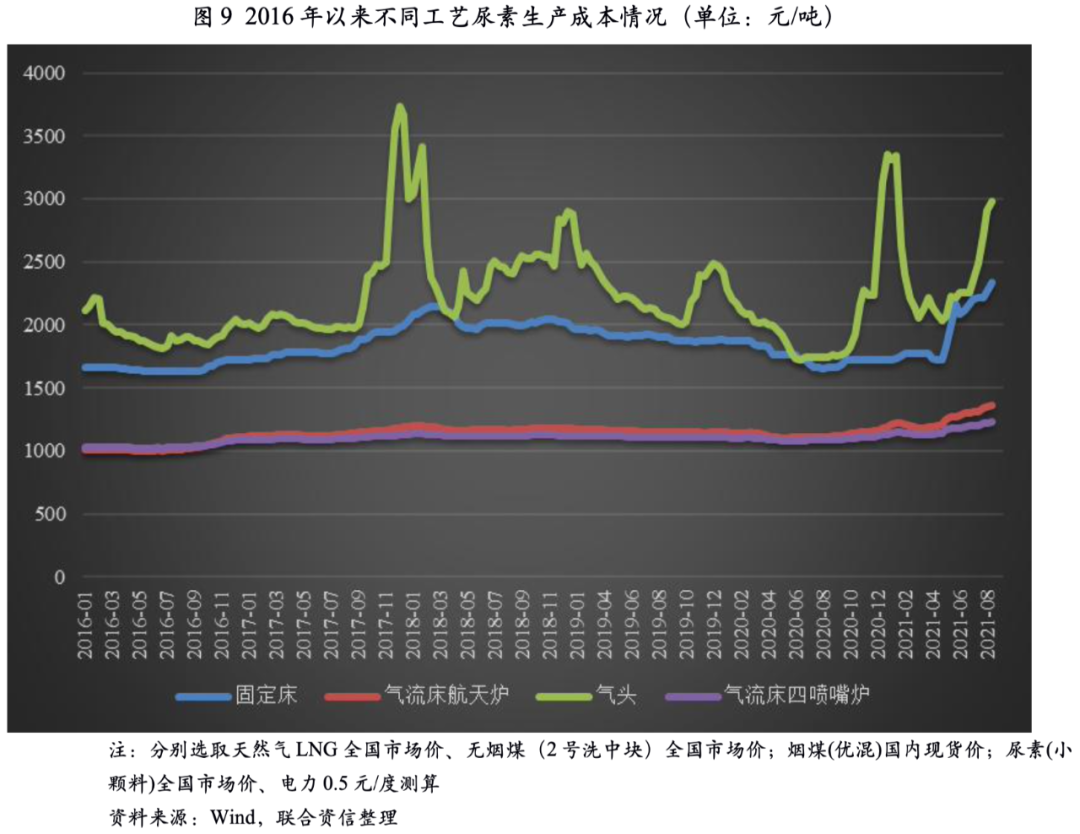 通過2016年以來無煙煤、煙煤及天然氣價格的走勢,粗略估算出不同工藝下尿素的成本走勢(如下圖)。從下圖可以看出,2016年以來,氣頭尿素成本在2000~2500元/噸浮動;煤頭固定床裝置成本在1500~2000元/噸浮動;煤頭氣流床裝置在1000~1500元/噸浮動,同時煤頭氣流床航天爐裝置和四噴嘴爐裝置的成本相差不大,但是四噴嘴爐裝置的生產成本整體略低一點,特別是在原材料價格上漲幅度較大的情況下優勢更為明顯;總體而言氣頭尿素成本>煤頭固定床裝置成本>煤頭氣流床裝置成本。