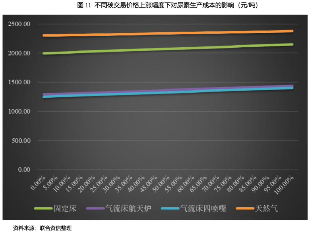 假設在其他期間費用、原材料價格(煙煤、無煙煤及天然氣基礎價格采用2016年以來的市場平均價格,分別為576.38元/噸、1027.92元/噸和2.54元/立方米)以及電價為0.5元/度不變,在碳交易起始價格50元/噸(自7月份全國碳市場交易啟動以來,全國碳配額價格一直維持在50元/噸以上,期間最高價曾超過60元/每噸,因此下文假設碳交易成本為50元/噸作為起始成本),不同工藝下尿素的生產成本上漲幅度如下表所示。同時,通過不同碳交易價格測算出不同工藝的生產成本如下圖所示。通過測算可以看出天然氣對碳交易價格的敏感性最高,固定床裝置對碳交易價格的敏感性最低。雖然煤頭尿素的碳排放量遠高于氣頭尿素,但碳交易后煤頭尿素企業的單噸生產成本仍低于氣頭尿素。整體看,碳交易成本對尿素生產成本的敏感性較低。
