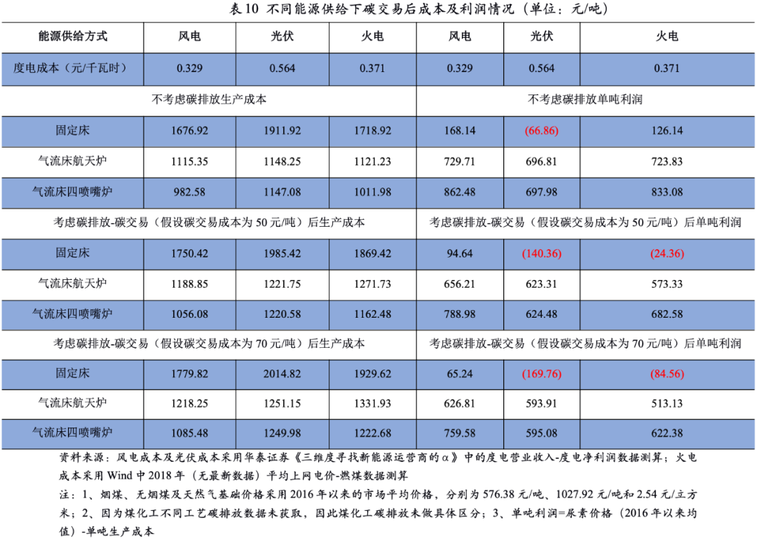 當前我國電力供給主要有光伏、風電、火電及核電,下文假設尿素生產過程中電力及熱能主要通過光伏、風電、火電三種方式自供。風電及光伏自供的度電成本采用市場上風電或光伏企業2016-2020年的度電營業收入–度電凈利潤平均值測算,火電自供的度電成本采取上網電價測算。同時,光伏及風電作為清潔能源,在能耗產生過程中的碳排放量為零;進而考慮在碳交易(假設碳交易成本為50元/噸)的背景下,測算不同能源供應下碳交易后成本及利潤情況。從下表可以看出,風電的度電成本較低,不同工藝下均具有成本優勢,其中氣流床四噴嘴爐裝置的生產成本最低。光伏因為度電成本較高,不同工藝下生產成本均高于火電及風電的能源供應方式;而氣流床航天爐裝置和氣流床四噴嘴爐裝置的生產成本相當。在考慮碳排放-碳交易后可以看出,風電作為能源供應的方式成本優勢更為明顯。光伏作為能源供應的方式下,氣流床航天爐裝置的成本優勢大于火電,其他工藝仍然不及火電;但是隨著碳交易成本提升,光伏作為能源供應的方式成本優勢均大于火電。整體看,風電基于其較低的度電成本及清潔性導致碳排放量較少進而具有很大的優勢,但是尿素企業就地獲取風電資源的難度較大。光伏資源清潔性較好,但度電生產成本較高,在碳交易價格低于70元/噸時,優勢不太明顯。但是未來隨著碳排放指標的逐步收緊,碳交易價格或將持續提升,光伏作為清潔能源將替代火電資源成為尿素企業的主要能源供應來源。