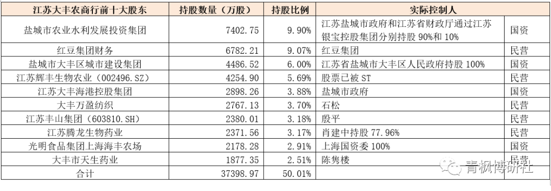 從江蘇大豐農商行的前十大股東來看,其股東背景整體偏弱,前十大股東中國資背景僅有4家(持股比例合計為22.69%),且國資背景的股東為財政實力較弱的鹽城市政府。此外,江蘇大豐農商行的民營背景股東實力也不強,如江蘇輝豐生物農業(yè)(002496.SZ)已被ST。