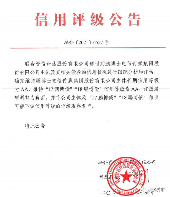 7月27日,聯合資信公告稱,確定維持鵬博士(600804.SH)主體長期信用等級為AA,維持“17鵬博債”、“18鵬博債”信用等級為AA,評級展望調整為負面,并將其主體及相關債項移出可能下調信用等級的評級觀察名單。