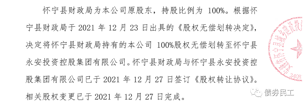 7、根據(jù)安徽省懷寧縣城鄉(xiāng)建設(shè)投資發(fā)展有限責(zé)任公司(主體信用等級(jí)AA-)2022年1月20日的公告,懷寧縣財(cái)政局決定將其持有的公司100%股權(quán)無(wú)償劃轉(zhuǎn)給懷寧縣永安投資控股集團(tuán)有限公司。懷寧縣永安投資控股集團(tuán)有限公司未發(fā)行過(guò)債券。