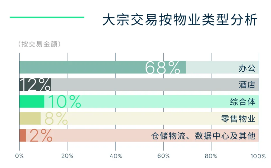 綜合體交易成為年內第二大需求成交類型,成交額主要來自某資產包,該資產包的標的物業為一個城市綜合體,涵蓋寫字樓、酒店、商業和公寓,總成交金額高達人民幣66億元。