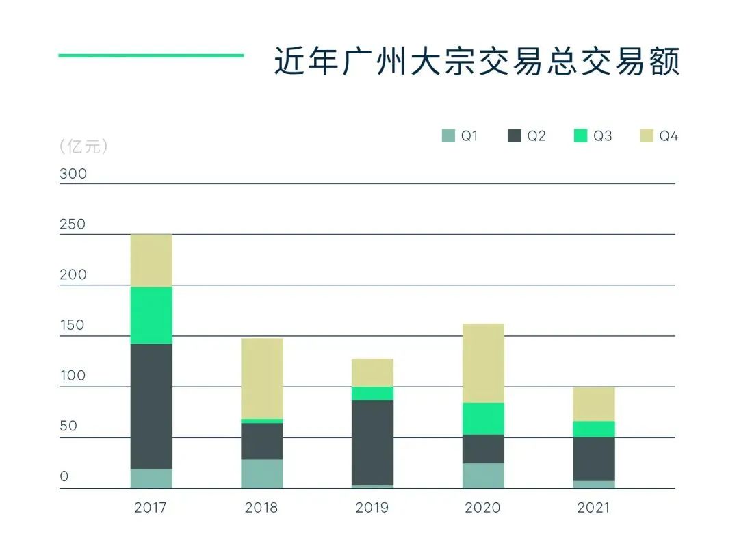 據世邦魏理仕數據顯示,2021年廣州錄得交易14宗,總成交金額約為102億元人民幣(未統計關聯交易),同比減少38%。