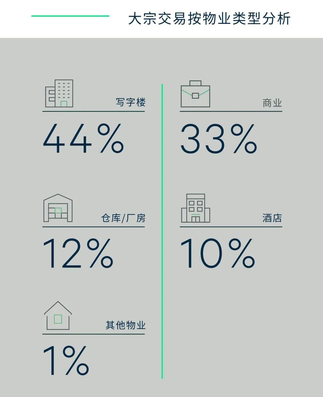 從成交業類型來看,寫字樓依舊是交易主體,占到總成交量的43%,零售物業交易上揚,而產業物流、數據中心的交易額在過去一年實現快速增長,成交量同比幾乎翻倍,占總成交額31%。