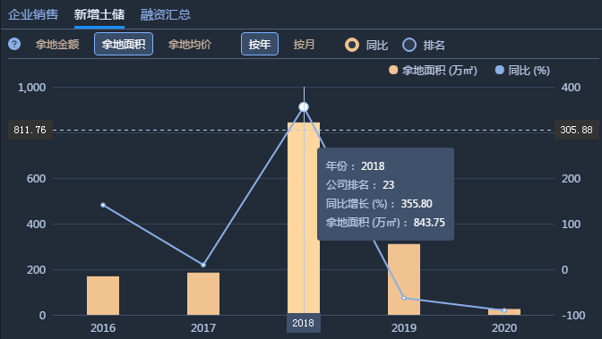 2018年,禹洲地產并新增了土地儲備843.75萬平方米,同比增長355.80%。但是在2018年禹洲全年銷售額560.03億元,并沒有達成全年600億元的目標。