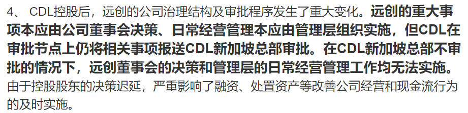 CDL收購協信遠創50.1%股份后,董事會設8席,CDL占4席,并不占多數,由CDL首席執行官郭益智和吳旭擔任聯席董事長,具體事務仍由職業經理人團隊負責,被認為是由協信和CDL共同控制。這種體制下,雙方碰到問題就開始扯皮。協信方指責CDL控制公司但不作為,CDL方則反戈一擊,雙方開始口舌之爭,嚴重影響決策效率。