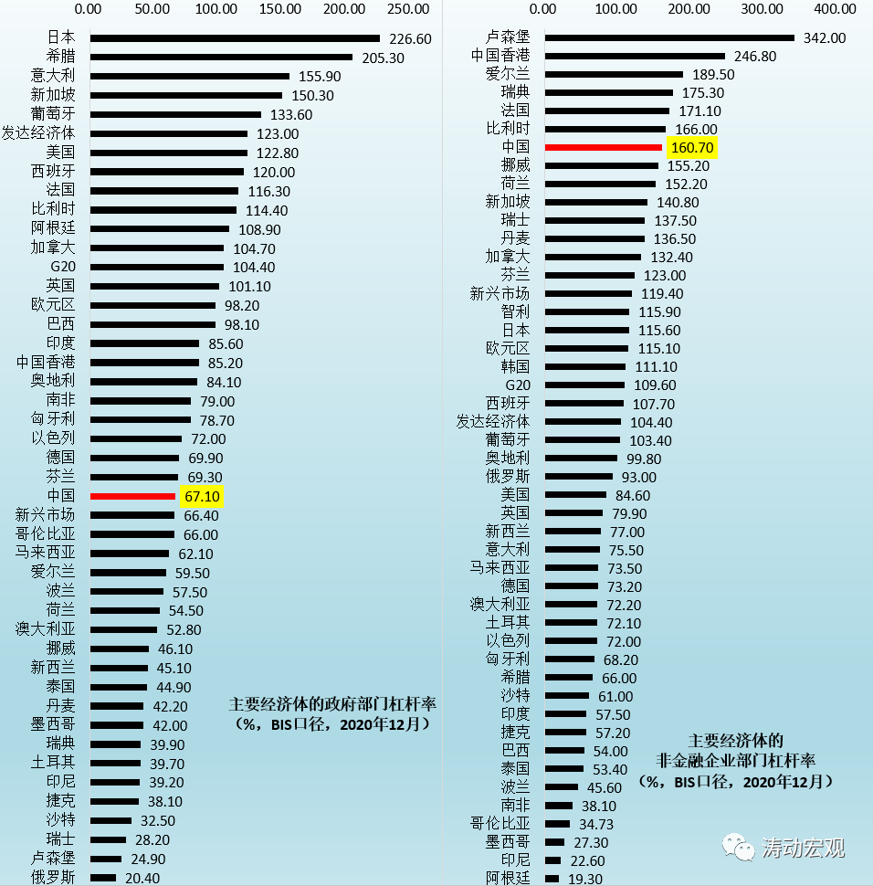 如果不考慮政府隱性債務(wù),則中國(guó)政府部門(mén)的宏觀杠桿率處于可控位置,2020年12月為67.10%,和新興市場(chǎng)經(jīng)濟(jì)體的66.40%以及德國(guó)的69.90%基本相當(dāng),低于印度的85.60%和美國(guó)的122.80%。