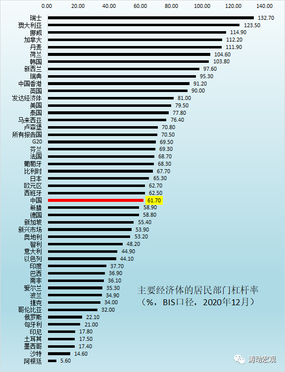 1、2020年12月中國(guó)居民部門(mén)的杠桿率為61.70%,和德國(guó)的58.80%基本相當(dāng),低于日本的65.30%和美國(guó)的79.50%,高于新興市場(chǎng)的53.90%。因此從數(shù)值上看似乎中國(guó)居民部門(mén)的宏觀杠桿率比較適中。但從央行公布的數(shù)據(jù)來(lái)看,BIS口徑下的居民部門(mén)杠桿率存在明顯低估,若以央行口徑來(lái)說(shuō),中國(guó)居民部門(mén)杠桿率2020年已達(dá)到72.50%,較美國(guó)僅低7個(gè)百分點(diǎn)。