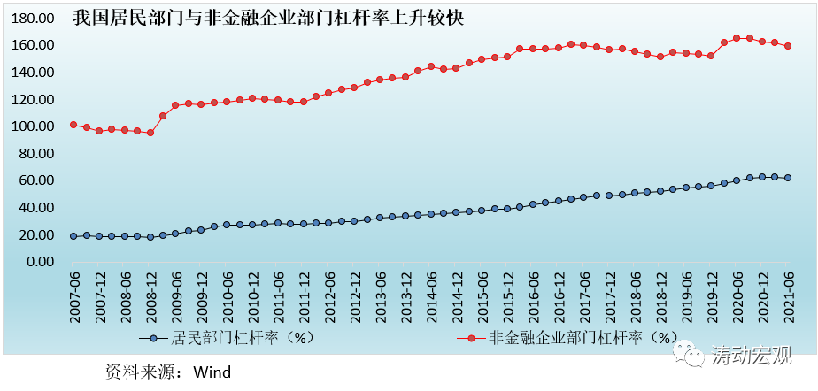 08年金融危機(jī)以來(lái),我國(guó)非金融企業(yè)部門(mén)和居民部門(mén)的杠桿率上升較快。其中,居民部門(mén)杠桿率已從2008年的17.90%大幅升至2021年6月的62%,12年的時(shí)間里累計(jì)上升了44個(gè)百分點(diǎn);非金融企業(yè)部門(mén)杠桿率則從2008年的95.20%大幅升至目前的158.80%,12年的時(shí)間里累計(jì)上升了63.60個(gè)百分點(diǎn)。
