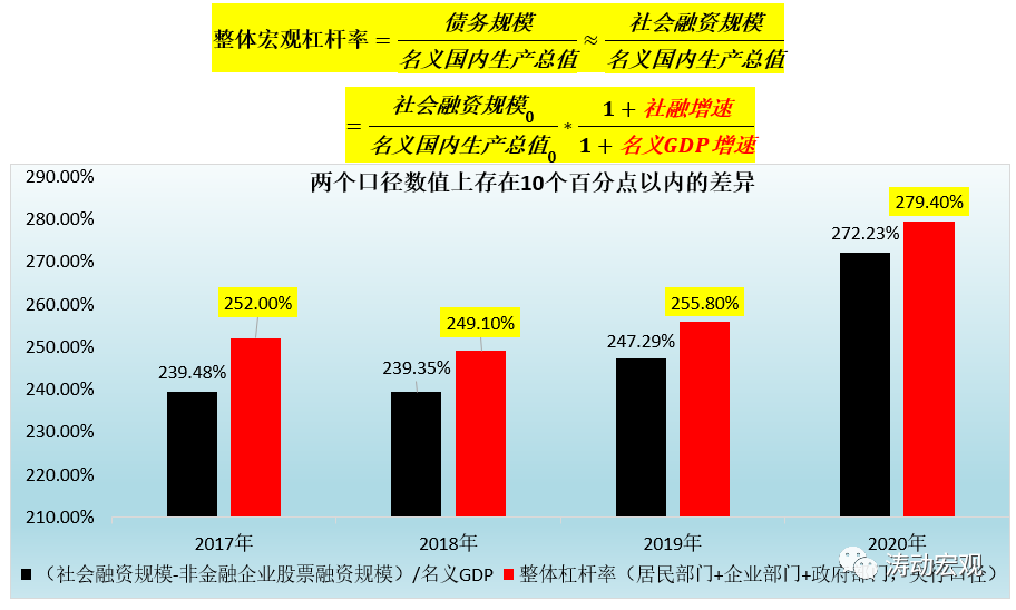 2、顯然我們可以基于社會(huì)融資規(guī)模指標(biāo)(剔除股票融資)來(lái)計(jì)算對(duì)應(yīng)宏觀杠桿率,并與央行口徑下的宏觀杠桿率進(jìn)行對(duì)比,結(jié)果發(fā)現(xiàn)二者在數(shù)值上約存在10個(gè)百分點(diǎn)以?xún)?nèi)的差異,這意味著剔除股票融資后的社會(huì)融資規(guī)模與實(shí)體經(jīng)濟(jì)承受的整體債務(wù)水平還存在一定的差異。不過(guò)這種差異比較穩(wěn)定,說(shuō)明社會(huì)融資規(guī)模指標(biāo)具有一定代表性,未來(lái)社會(huì)融資規(guī)模指標(biāo)口徑上還需要擴(kuò)容,以匹配宏觀杠桿率指標(biāo)的計(jì)算,畢竟社會(huì)融資規(guī)模指標(biāo)代表著實(shí)體經(jīng)濟(jì)從金融體系獲得的資金,其內(nèi)涵中便包括實(shí)體經(jīng)濟(jì)承擔(dān)的債務(wù)規(guī)模。