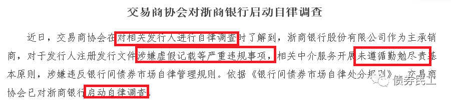在此次自律處分之前,中國銀行間市場交易商協(xié)會于2021年4月6日公告,對浙商銀行啟動自律調(diào)查,主要原因是浙商銀行“對于發(fā)行人注冊發(fā)行文件涉嫌虛假記載等嚴(yán)重違規(guī)事項”,這次自律調(diào)查的起因是在“對相關(guān)發(fā)行人進行自律調(diào)查時”發(fā)現(xiàn)的,也就是線索可能直接來源于發(fā)行人。目前尚不清楚6月18日的這次自律處分的結(jié)果是否是交易商協(xié)會4月啟動自律調(diào)查的結(jié)果。