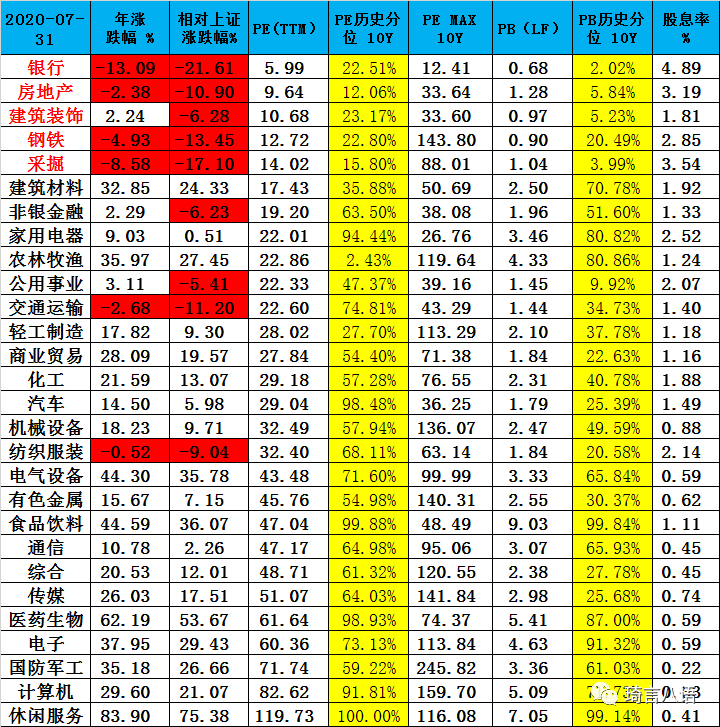 附一:申萬一級行業 漲跌幅、估值、股息率、ROE等