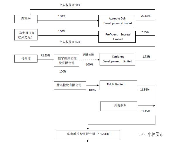 從股權結構看,鄭松興通過Accurate Gain Developments Limited持有華南城28.5%股權,鄭大報通過Proficient Success Limited持有7.27%股權,鄭松興為鄭大報胞弟,公司實際控制人為鄭松興家族。