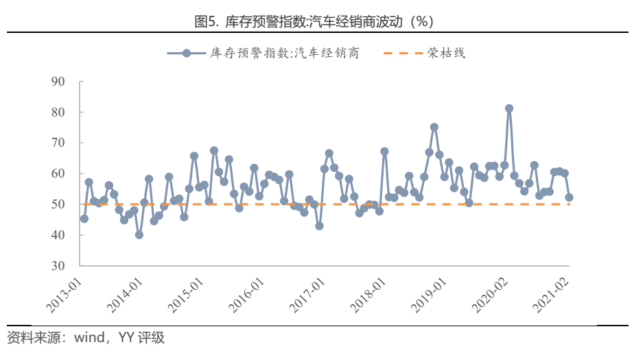 經銷商庫存預警指數是庫存滯留資金/流通資金,以50%為榮枯線,2015年以來我國經銷商庫存預警指數平均值為57.0%,長期位于榮枯線以上,意味著庫存壓力長期較大。2020年2月,受疫情影響,汽車銷路不暢,4S店庫存積壓,庫存預警指數達到81.2的%的歷史高點,隨后隨著疫情緩解,汽車銷量恢復,庫存指數有所回落。至2021年2月,即傳統淡季,庫存預警指數落至52.2%,已經低于往年2月份的預警指數,短期進入相對安全區間。