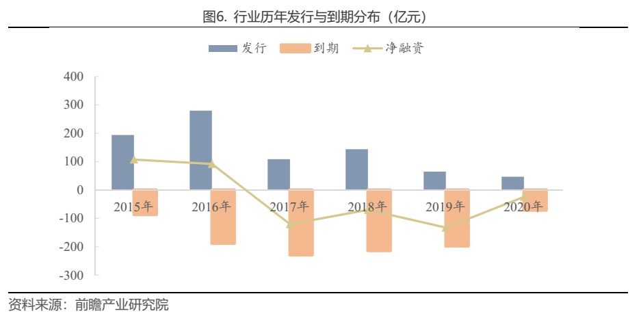經歷2015年、2016年兩年大規模融資,自2017年以來,汽車銷售行業凈融資額持續為負,或與近些年來汽車銷售增速放緩,汽車銷售企業減緩拓展4S店的步伐,從而資金需求減弱所致。2020年,行業債券發行額與到期額均大幅減少,僅發行46.7億元(其中34億元都是由廣匯集團及其子公司發行),到期70.7億元,凈融資規模為-24.0億元??傮w來說,債券市場對于汽車銷售行業并不友好。