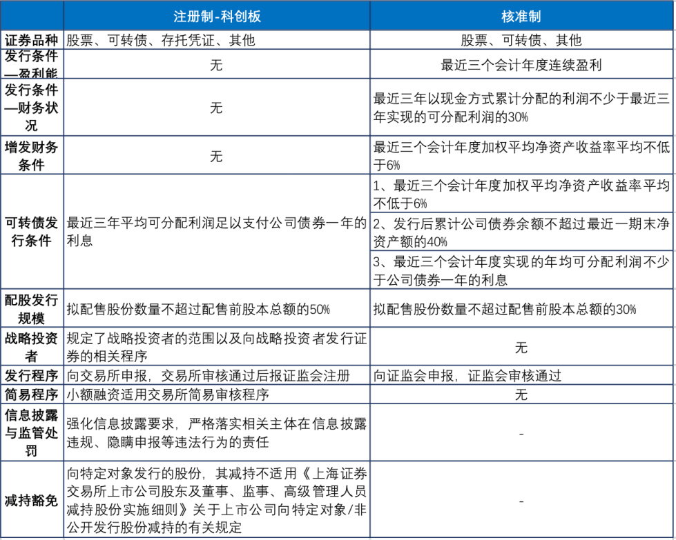 作為注冊(cè)制下證券規(guī)則的重要組成部分,科創(chuàng)板再融資新規(guī)體現(xiàn)了注冊(cè)制下證券發(fā)行融資的特點(diǎn)。與核準(zhǔn)制下再融資規(guī)則相比,差異主要體現(xiàn)在:證券品種范圍、發(fā)行條件、發(fā)行程序、信披要求等方面。
