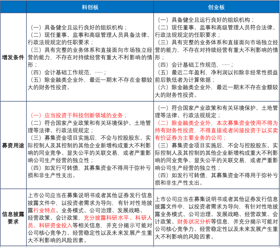 本次科創(chuàng)板再融資新規(guī),與創(chuàng)業(yè)板再融資新規(guī)內(nèi)容基本一致,二者在定價(jià)方式、鎖定期和融資規(guī)模等核心要素方面完全趨同。程序上都體現(xiàn)了交易所審核、證監(jiān)會(huì)注冊(cè)的注冊(cè)制特點(diǎn)。但兩者在增發(fā)條件、募資用途、信披要求上略有不同,體現(xiàn)了板塊定位的差異,具體差異體現(xiàn)在: