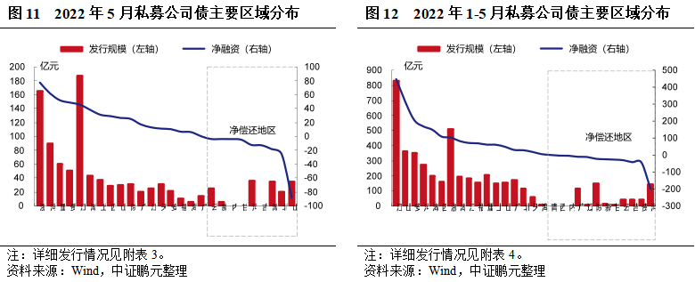 私募公司債券方面,2022年5月份,公募公司債券的發行人分布于23個地區,以江蘇、浙江、河南等地為主。從發行規模來看,江蘇發行187.11億元位居榜首,浙江發行165.87億元位居第二,河南發行90.10億元位居第三位,發行數量分別為33只、17只、12只。浙江、河南、重慶分別以凈融資77.39億元、61.83億元、51.79億元位于前三位,山東、北京、湖南分別凈償還88.63億元、25.80億元、18.46億元。綜合1-5月,江蘇以發行209只、累計發行規模828.02億元位居首位,遠高于其地區;浙江以發行104只、累計發行規模510.18億元位居第二;山東以發行68只、累計發行規模364.09億元位居第三;浙江、安徽、江蘇分別以累計凈融資449.80億元、315.27億元、211.15億元位于前三位,北京、云南、新疆分別凈償還199.30億元、43.61億元、42.80億元。