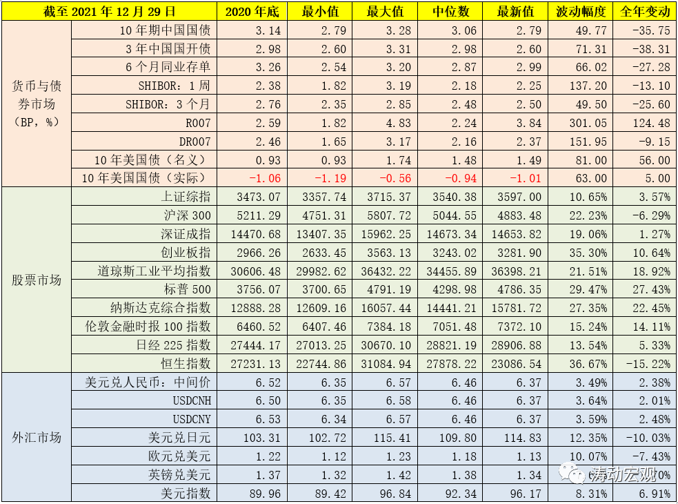 潮起潮落下,一切即將塵埃落定?;赝?021年全年,應清醒地認識到,當前全球經濟只是反彈,還未真正復蘇,多數經濟體并未恢復到疫情前水平,一些問題的存在仍然讓人頭疼,如疫情起伏反復嚴重干擾復蘇進程、不同地區復蘇分化發展失衡威脅增長的可持續性、高企的通脹尚未出現緩解跡象(對企業和民眾的困擾需要引起關注),供應鏈產業鏈受阻的“隱患”仍在間歇性發作、新興經濟體和發展中國家對美聯儲政策節奏的變化憂心忡忡等等。過去這一年,雖然中國經濟總量即將邁入110萬億元大關、人均GDP將達到1.20萬美元(逼近高收入國家水準),但我們卻經歷了經濟基本面的倒“V”型反轉和下半年以來的超預期下行,經歷了A股市場近幾年以來表現最為一般的一年(雖然創業板仍在繼續大幅上行以及A股全年成交金額突破2015年的紀錄)以及恒指連續兩年的下挫,亦經歷了2015年以來人民幣匯率波動幅度最小的一年(全年不到4%)。同樣是這一年,美聯儲Taper進程明顯加快以及加息步伐預期明顯提前、美元指數與美債收益率顯著上行、美國三大股指引領全球,中國與美國之間的第二階段博弈在Biden時代的第一年迎來了新的特征以及地緣政治格局博弈愈加劇烈。依然是這一年,我們看到雖然中國經濟在疫情之后率先反彈,但在反彈之后經濟基本面亦比其它經濟體率先進入下行通道(今年1-3季度的當季GDP增速分別為5%、5.50%和4.90%),未來若干年的中國經濟可能均需要為?!?%”而不斷努力,年終政治局會議與中央經濟工作會議則相應提出“穩字當頭、穩住宏觀經濟大盤”的政策基調,并做出“需求收縮、供給沖擊、預期轉弱”的基本判斷,因為政策部門與市場均應認識到,經濟基本面的運行是有慣性的且某種程度上不以人的意志為轉移,經濟增速一旦落下來,就很難再上去,所以現在要讓它落的慢一些、溫柔一些,從這個角度看持續收緊的貨幣環境應已很難重現。還是這一年,城投政策趨嚴與地產行業重塑牽動著整個市場的神經,綠色金融漸成氣候、碳貨幣趨勢愈發明顯,新三板、北交所、創業板與科創板正持續為科創類企業提供加持平臺。