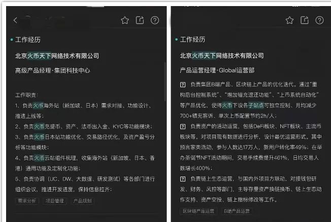 上述用戶的共同點在于,大量huobi global工作人員在北京火幣天下網絡科技有限公司入職,期間涉及多個部門,工作內容也都涉及到實際業務運營,還包括不同部門之間的對接協調。