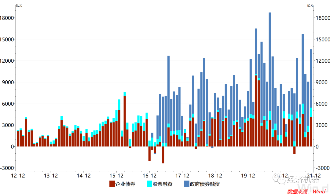 4)新增社會融資總額中,政府債券融資和企業(yè)債券融資是同比多增的主要拉動項(xiàng)。11月新增社會融資總額2.61萬億元,同比多增4745億元。其中,政府債券融資新增8158億元,同比多增4158億元,企業(yè)債券融資新增4104億元,同比多增3264億元,是新增社會融資同比多增的主要拉動因素。