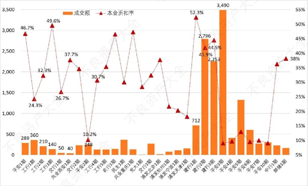 成交額固然是資產(chǎn)管理公司競(jìng)價(jià)的時(shí)候考慮的重要因素之一,但成交額主要受預(yù)算限制,真正體現(xiàn)不良資產(chǎn)價(jià)格實(shí)質(zhì)上是本金折扣率。從已經(jīng)公布成交情況的若干期不良資產(chǎn)來(lái)看,平安銀行的本金折扣率整體偏低,建設(shè)銀行的正好相反,這也與各銀行出讓的不良資產(chǎn)總體情況相吻合。各期中本金折扣率最高的為建行1期,其也是各期中質(zhì)量最高的不良資產(chǎn)之一。
