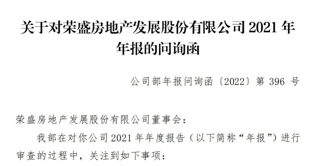 據(jù)公開披露,2022年5月25日,深交所再次下發(fā)了“關(guān)于對榮盛房地產(chǎn)發(fā)展股份有限公司 2021 年年報的問詢函”,一共八問、問問扎心。