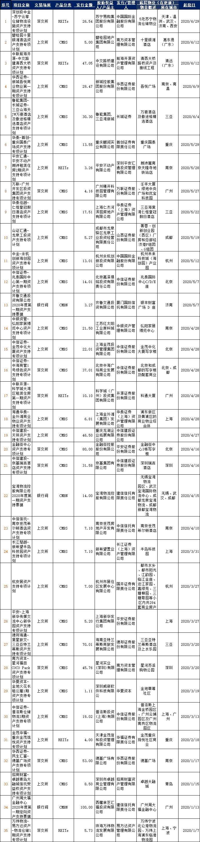 2020年1月1日至2020年6月30日,國內已發行CMBS(含CMBN、下同)/類REITs產品35單,總規模815.44億元(不含儲架規模),其中類REITs產品6只、CMBS產品29只(含CMBN3只)。其中以購物中心/商場為底層資產的CMBS/類REITs產品25只。標的物業分布以上海/北京居多及其他強二線城市為主。