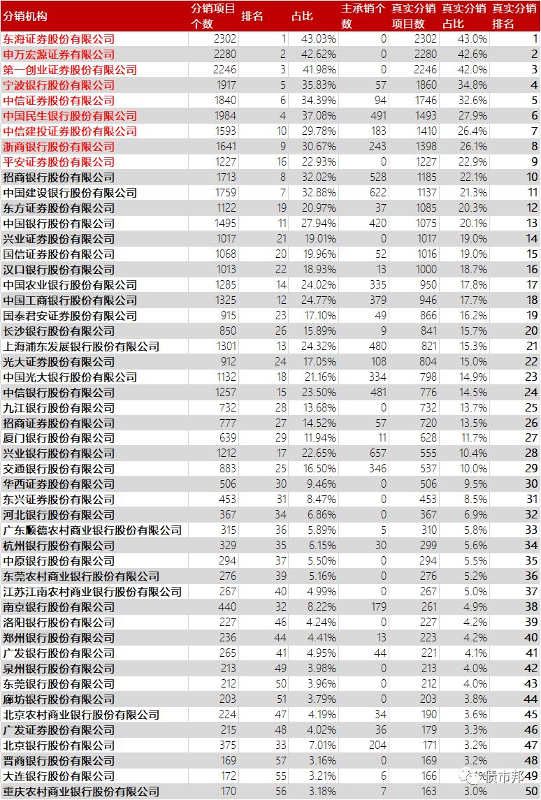 因為主承銷商天然就是承銷團員,而狹義上的分銷是承銷團員參與銷售非所在機構(gòu)主承的債務(wù)融資工具的行為,為了更好地進行對比,將主承項目剔除后作為真實分銷項目進行排名出來的TOP50,結(jié)果如下所示。
