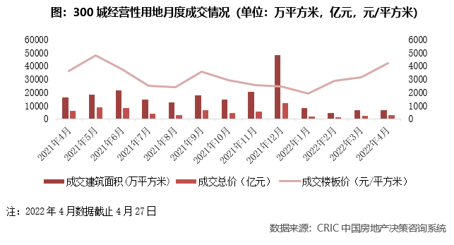 截至4月27日,全國300城經(jīng)營性土地4月總成交建筑面積僅6537萬平方米,同比降幅近六成,成交規(guī)模仍處于歷史地位水平。但是受到杭州、寧波、南京、天津等城市首輪集中土拍的影響,成交單價(jià)結(jié)構(gòu)性上漲,平均樓板價(jià)增至4210元/平方米,環(huán)比漲幅突出,高達(dá)34%,同時(shí)也帶動(dòng)成交溢價(jià)率環(huán)比微增,較上月上漲了0.3個(gè)百分點(diǎn)至4.8%。