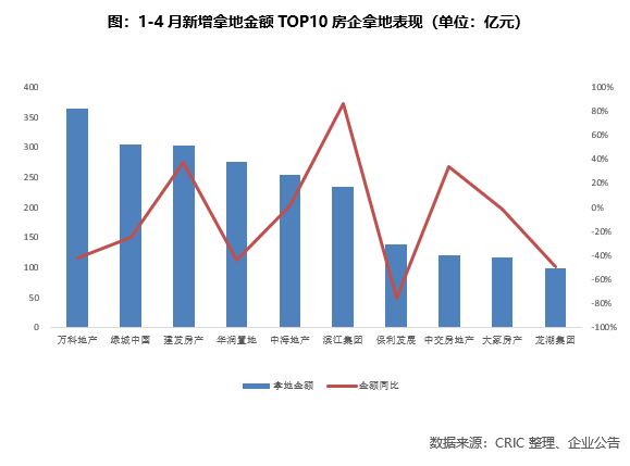拿地金額TO20中,超過半數(shù)是國企、央企,僅有碧桂園、龍湖、濱江、大家等少數(shù)民企。華潤、建發(fā)、中海等拿地金額均超過250億元。由此可見,當(dāng)前規(guī)模化的國央企如華潤、中海、保利、中交、建發(fā)等在核心城市拿地優(yōu)勢較大,尤其是部分集中供地城市”讓利“之下,優(yōu)質(zhì)、高性價(jià)比地塊補(bǔ)充可售貨值的同時(shí),也優(yōu)化了企業(yè)土儲(chǔ)結(jié)構(gòu)。民企中,受益于集中供地,一些區(qū)域深耕的房企表現(xiàn)較為突出。如濱江、大家等在杭州均收獲頗豐。其中濱江1-4月新增拿地金額233.8億元,同比增長86%,拿地幾乎全部集中在杭州。