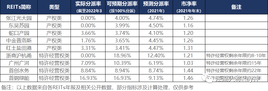 目前已經(jīng)發(fā)行的12個(gè)公募REITs里,產(chǎn)權(quán)類的和特許經(jīng)營(yíng)權(quán)類的各占一半。從第一批那9個(gè)REITs已經(jīng)披露的年報(bào)來(lái)看,產(chǎn)權(quán)類的REITs分派率顯然是低于特許經(jīng)營(yíng)權(quán)類的。并且,即便按FAD進(jìn)行100%分派來(lái)計(jì)算的股息率,產(chǎn)權(quán)類的REITs表現(xiàn)都仍不及預(yù)測(cè)目標(biāo);與之相反的是,特許經(jīng)營(yíng)權(quán)類的基本上全都超過(guò)了預(yù)測(cè)。