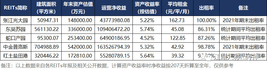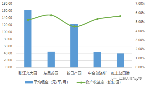 對(duì)于依托租金收益的產(chǎn)權(quán)類REITs,我們可以先簡(jiǎn)單地從租金的維度上進(jìn)行比較。目前的所有公募REITs里張江光大園的租金水平是最高的,平均租金達(dá)5.35元/平/天;其次是蛇口產(chǎn)園122.85元/平/月。那是不是他們的運(yùn)營(yíng)能力比別家都要強(qiáng)呢?其實(shí)未必,畢竟這兩家的資產(chǎn)是在上海和深圳,租金高一些似乎是情理之中的。如果我們把幾個(gè)REITs的資產(chǎn)收益率都算一下,就會(huì)發(fā)現(xiàn)恰恰這兩家的資產(chǎn)收益率比其他幾家都要低。