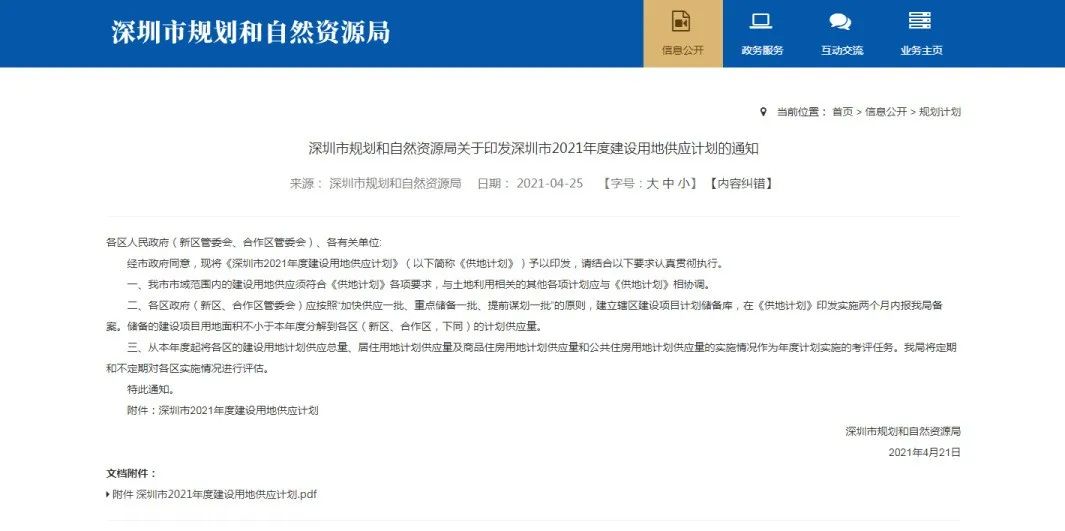 4月25日,深圳規自局發布《深圳市2021年度建設用地供應計劃》。