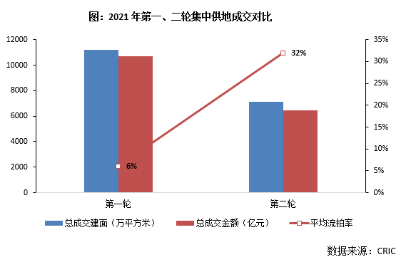 房地產(chǎn)市場(chǎng)“冷”主要體現(xiàn)之一在于房企流動(dòng)性普遍緊張,土地投資持續(xù)下行。就22城集中供地來(lái)看,由于調(diào)控政策密集,房企現(xiàn)金流深陷困局,導(dǎo)致第一輪與第二、三輪土拍局面大相徑庭。根據(jù)克而瑞監(jiān)測(cè),第二輪集中供地成交建面、成交金額都較第一輪顯著減少,且平均流拍率超過(guò)三成。目前深圳、南京、蘇州等部分城市第三輪集中供地也已經(jīng)落下帷幕,土拍熱度仍難有起色。