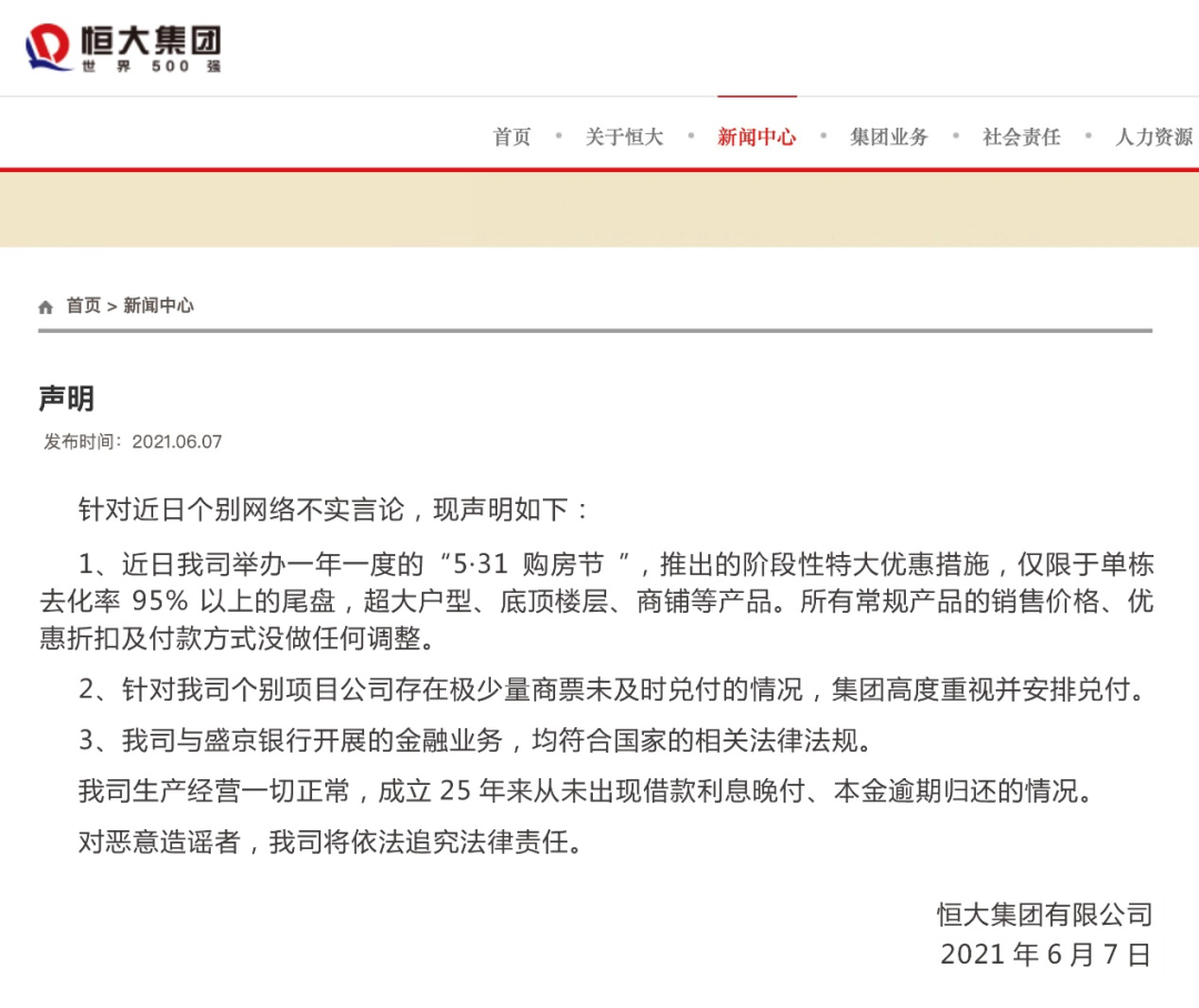 然而,在恒大“大象起舞”的過程中,也出現了一些質疑。6月7日,恒大發布聲明,稱公司生產經營一切正常,對惡意造謠者,將依法追究法律責任。