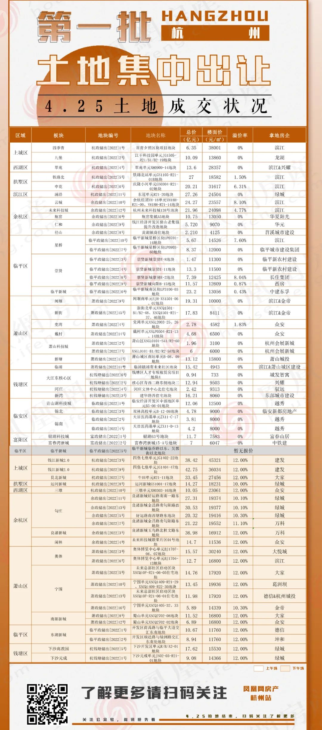 例如在民營經濟發達的杭州,今年集中成交的59宗地塊中,34宗被國資企業攬去,濱江、眾安、融信、德信、金帝等企業則撐起了民企的存在感,此場景一如2021年的第一次集中土拍,彼時尚有濱江、融信等民企積極參與。
