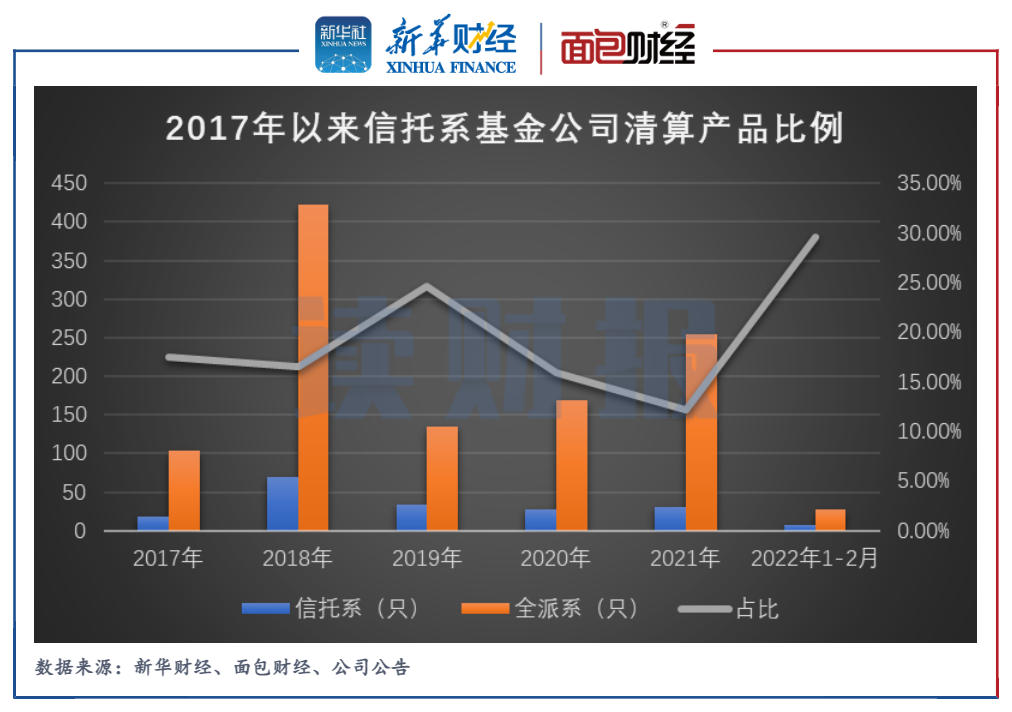 整體來看,2017-2021年信托系基金公司的179只公募產(chǎn)品被清盤,約占同期市場(chǎng)總清盤數(shù)量的17%。從每年的清算比例來看,除2019年比例約達(dá)25%,其余年份清算比例均在15%左右。進(jìn)入2022年,該比例顯著上升,截至2022年2月末該比例已接近30%。