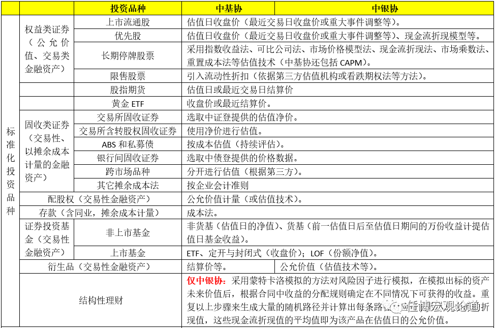 二、中基協(xié)與中銀協(xié)關(guān)于資管投資品種估值標(biāo)準(zhǔn)的對(duì)比